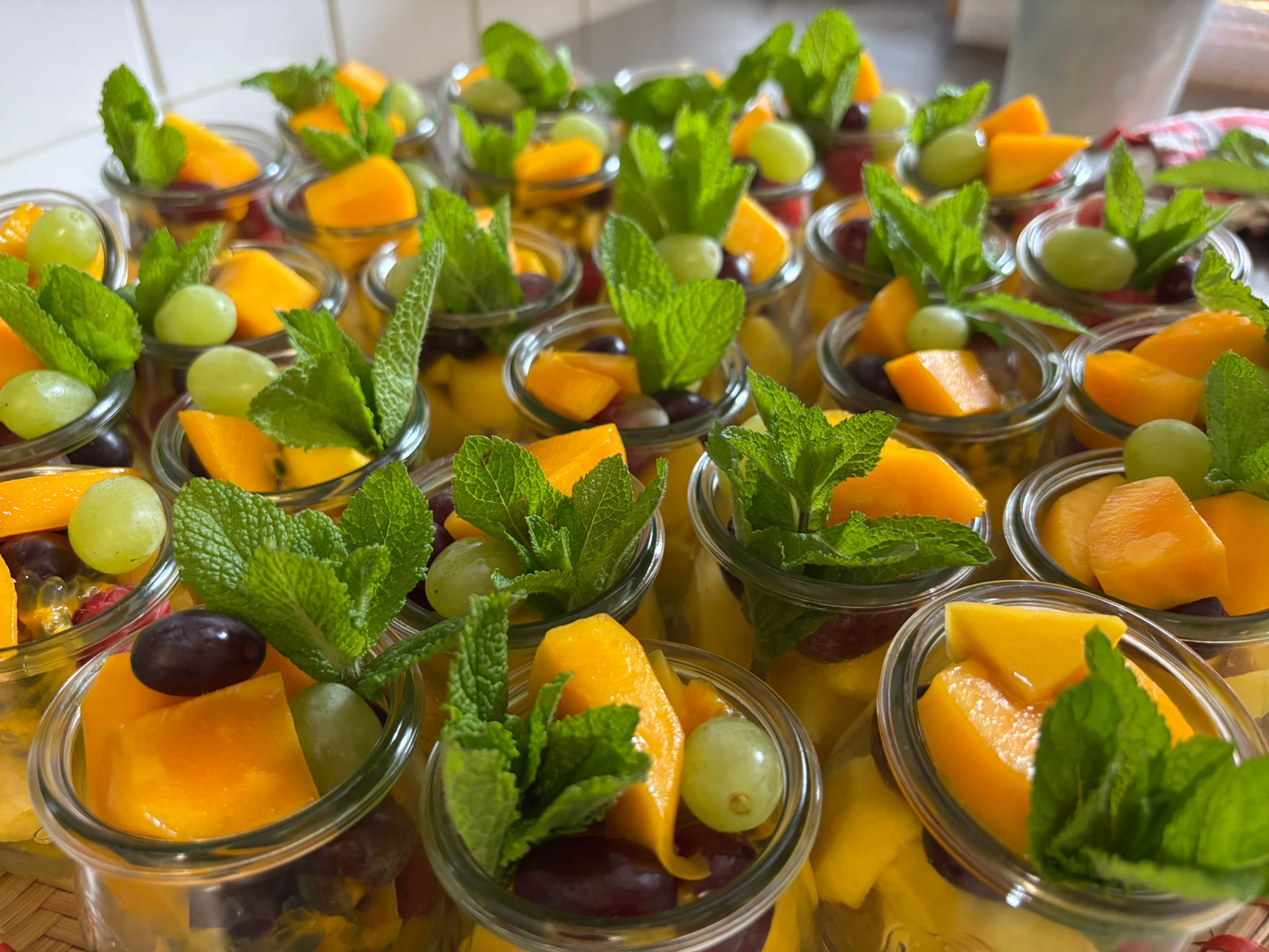 - - gebackenes Obst (Ananas, Banane, Litchi, Mango)